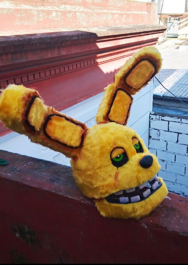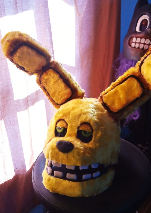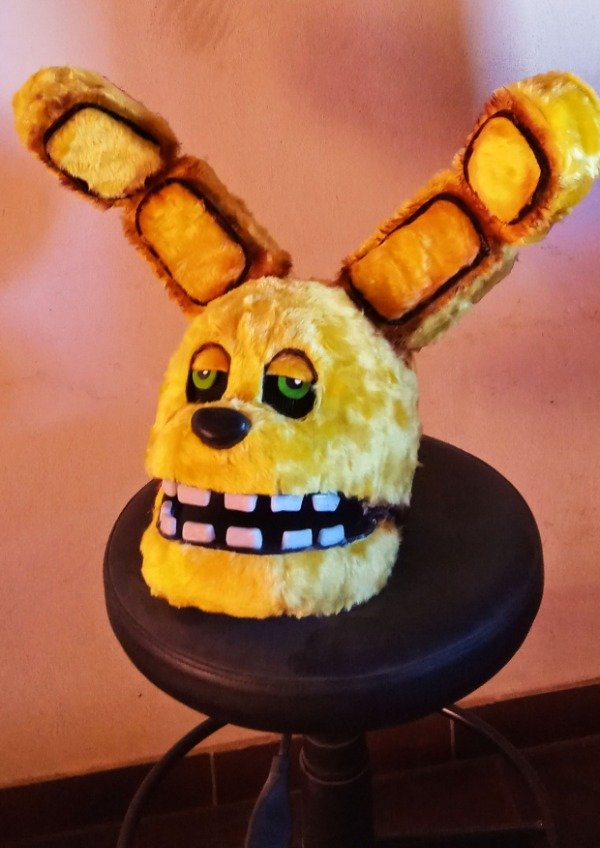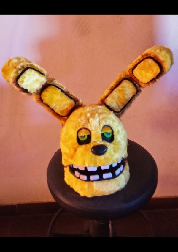 mascara de spring bonnie cabeza completa del juego fnaf. base de fibra de vidrio forrada en tela de peluche amarillo. en los ojos tiene una rejilla que permite ver con comodidad. por dentro tiene esponjas que permiten adaptarse mejor a la cabeza.
